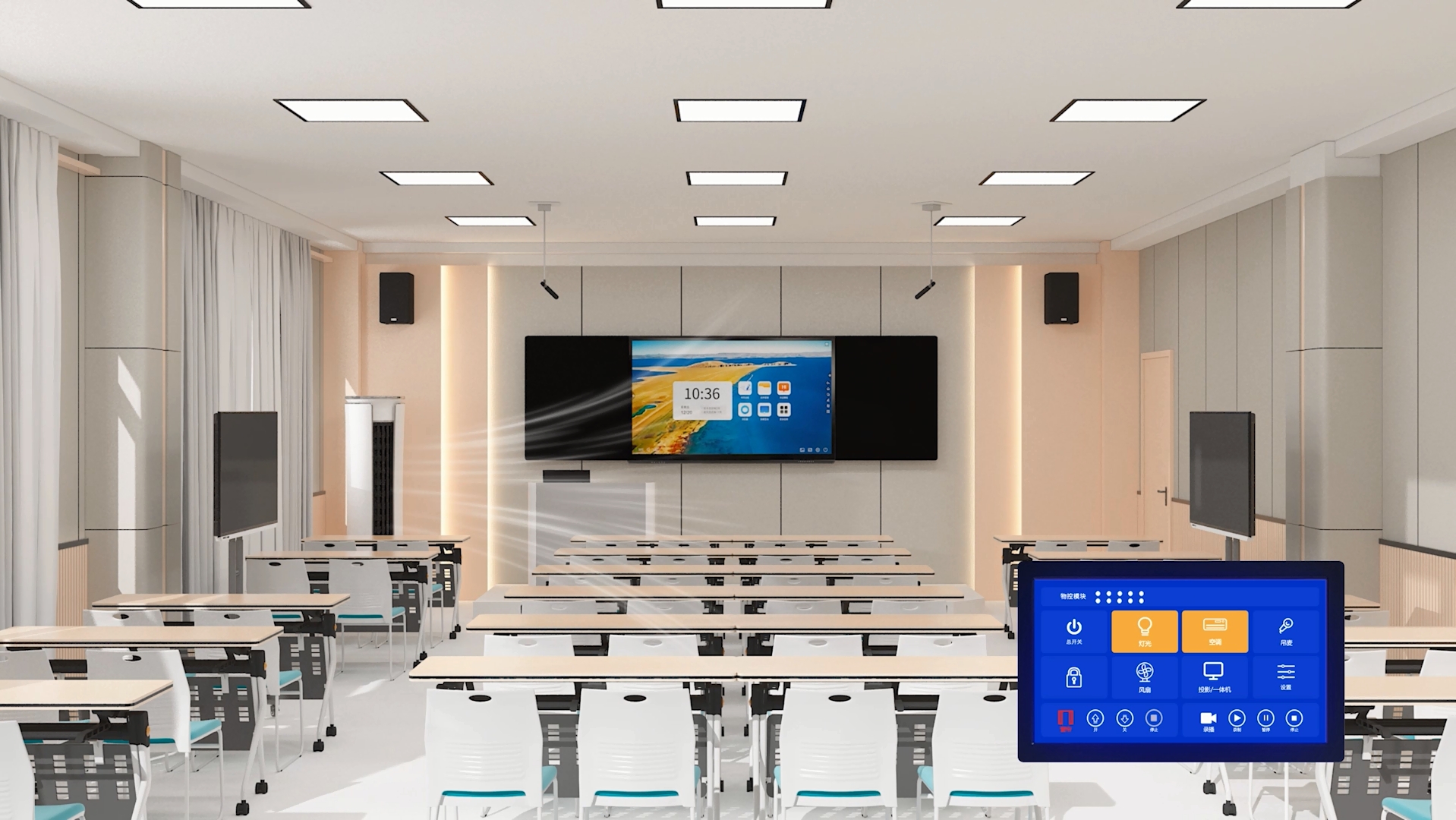 智慧教室3D建模效果教師通過平板一鍵切換擴聲/燈光模式/環境調控等設備 智慧課堂配套產品——控制系列丨教室智控教室智控數據監控·智能管...
